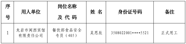 根据龙岩市属国有企业校园招聘有关要求,经报名、资格审查、组织考试、体检、考察等程序,现将龙岩市闽西宾馆有限责任公司餐饮部食品安全专员(岗位代码405)拟录用人员名单公示如下: