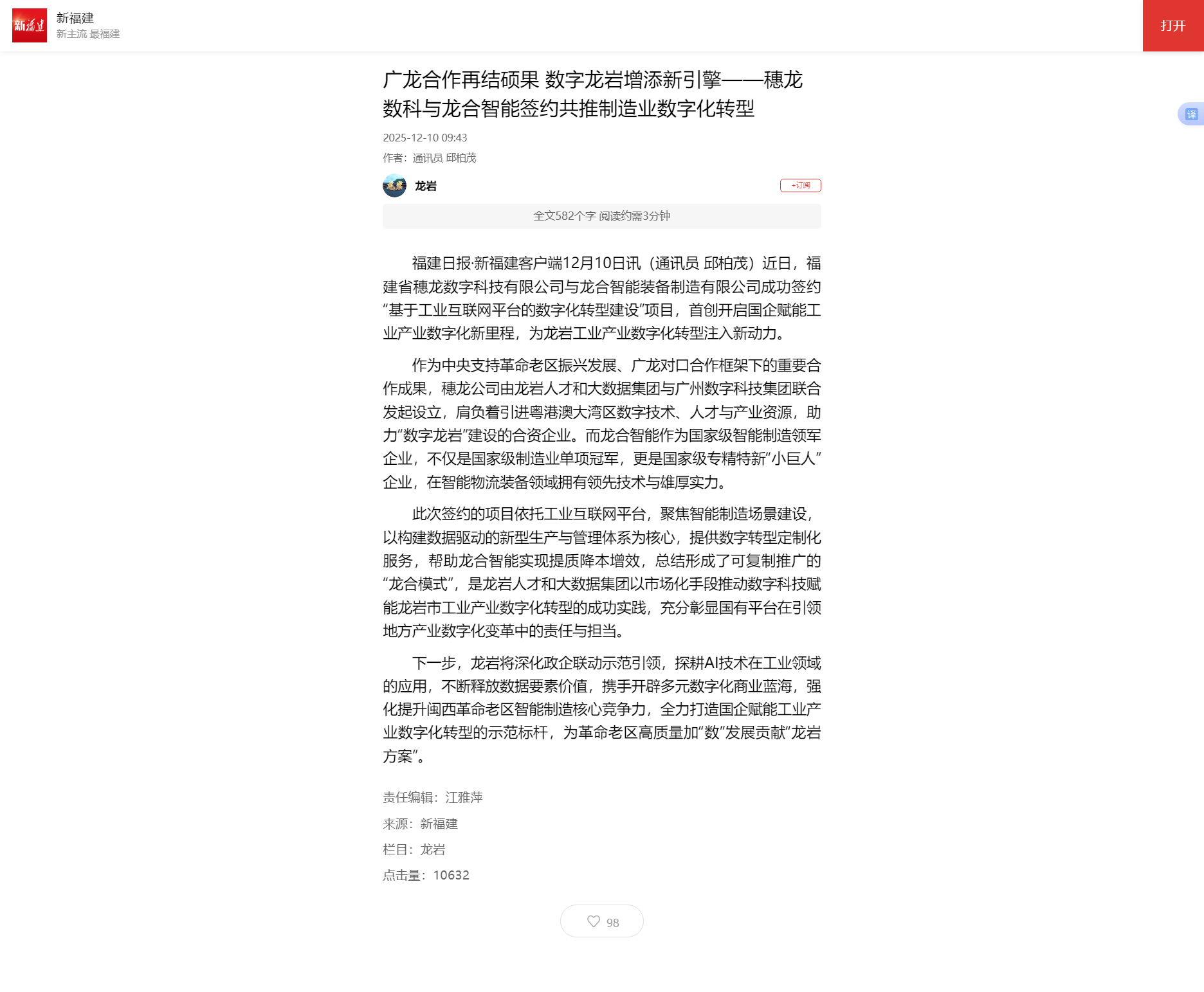 近日,福建省穗龙数字科技有限公司与龙合智能装备制造有限公司成功签约“基于工业互联网平台的数字化转型建设”项目,首创开启国企赋能工业产业数字化新里程,为龙岩工业产业数字化转型注入新动力。