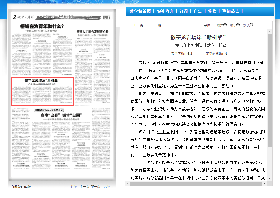近日,省、市级主流媒体《福建日报》、《海峡人才报》、《闽西日报》、《闽西快讯》刊介集团与龙合智能装备制造有限公司成功签约“基于工业互联网平台的数字化转型建设”项目。龙岩人才和大数据集团开启国企赋能工业产业数字化新里程,为龙岩工业产业数字化转型注入新动力。