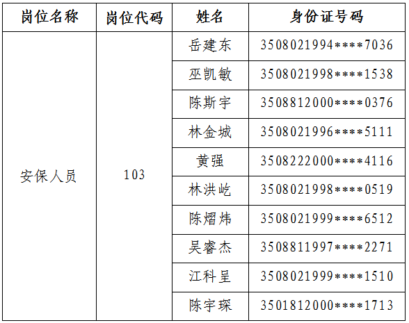 根据2020年4月9日发布的《关于龙岩城发物业有限公司公开招聘城发·望郡项目营销处工作人员的公告》有关要求,经报名、资格审查、组织考试、考察、体检等程序,确定岳建东等10位同志为拟聘用人选(第三批),现予以公示如下: