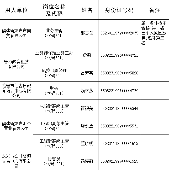 公示期至2020年12月2日止。在此期间,欢迎群众以来电、来信、来访的形式向龙岩人才发展集团有限公司反映情况、发表看法和意见。