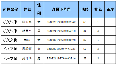 根据龙岩市新罗区城市管理局2021年1月13日发布的《龙岩市新罗区城市管理局面向全市公开选调工作人员的公告》有关要求,公开选调机关法律岗位及机关文秘岗位笔试环节已经我司组织完成,现将成绩予以公示,公示时间截止至2021年3月13日17:30分。如有异议,请与我司联系,联系电话:0597-2822833。