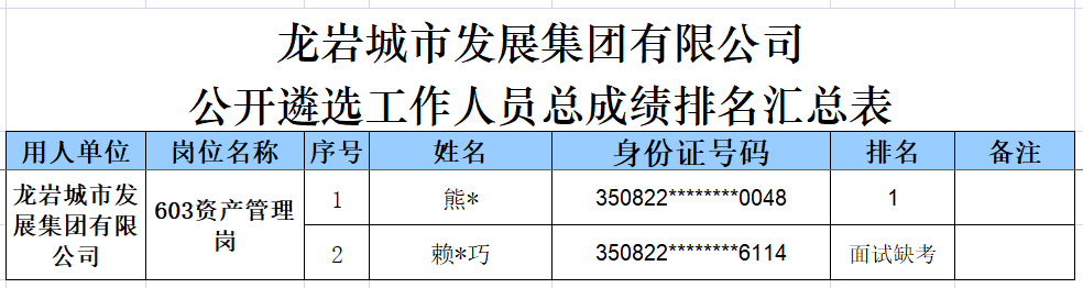 根据2021年8月26日发布的《关于龙岩城市发展集团有限公司所属企业公开招聘(遴选)工作人员的公告》有关要求,龙岩市政建设集团有限公司资产管理岗(岗位代码603)考试(面试)环节已经我司组织完成,现将总成绩排名予以公示。