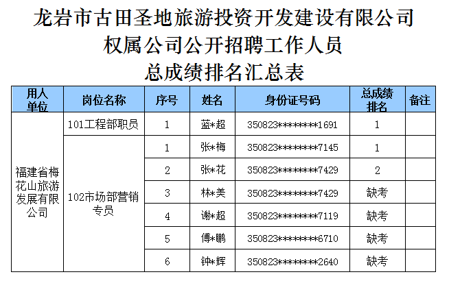 根据2021年12月28日发布的《福建省梅花山旅游发展有限公司关于公开招聘工作人员的公告》有关要求,福建省梅花山旅游发展有限公司工程部职员(岗位代码101)等2个岗位考试(笔试+面试)环节已经我司组织完成,现将总成绩排名予以公示。