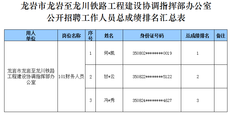 根据2022年2月28日发布的《关于龙岩市龙岩至龙川铁路工程建设协调指挥部办公室公开招聘劳务派遣人员的公告》有关要求,龙岩市龙岩至龙川铁路工程建设协调指挥部办公室财务人员(岗位代码101)考试(笔试+面试)环节已经我司组织完成,现将总成绩排名予以公示。