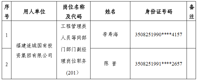 根据2022年1月18日发布的《福建连城国有投资集团有限公司关于公开招聘企业专业人才的公告》有关要求,经报名、资格审查、组织考试、体检、考察等程序,现将福建连城国有投资集团有限公司工程管理类人员等同部门部门副经理岗位职务(岗位代码201)拟录用人员名单公示如下: