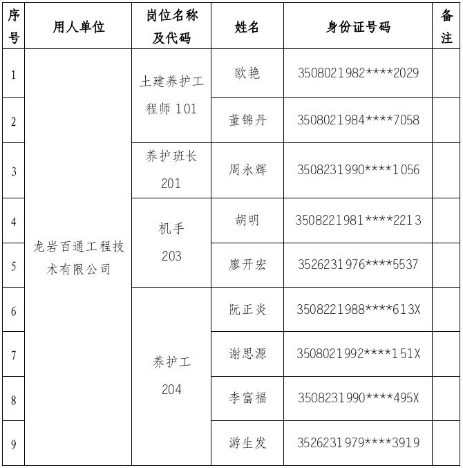 根据2022年4月21日发布的《关于龙岩百通工程技术有限公司公开招聘(遴选)养护专业人员的公告》有关要求,经报名、资格审查、组织考试、体检、考察等程序,现将龙岩百通工程技术有限公司土建养护工程师(岗位代码101)等4个岗位拟录用人员名单公示如下: