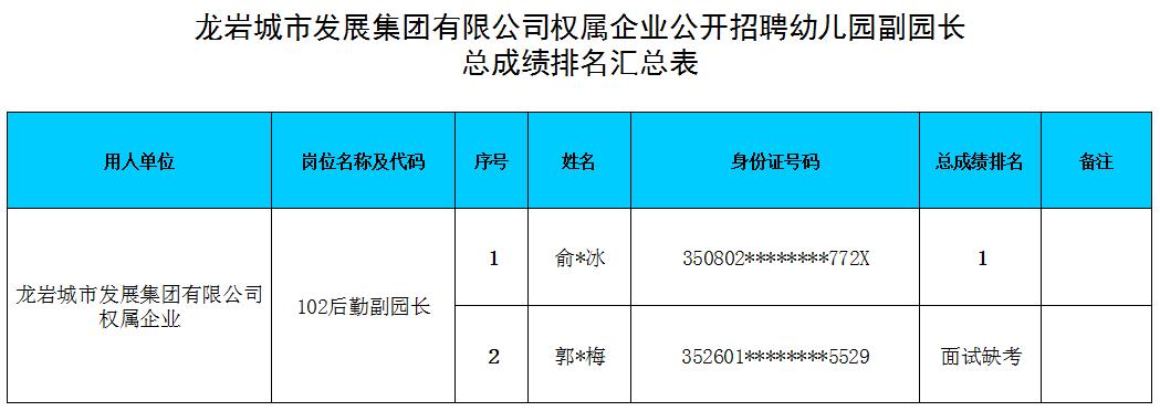根据2022年6月11日发布的《龙岩城市发展集团有限公司权属企业公开招聘幼儿园副园长的公告》有关要求,龙岩城市发展集团有限公司权属企业后勤副园长(岗位代码102)考试(面试)环节已经我司组织完成,现将总成绩排名予以公示。
