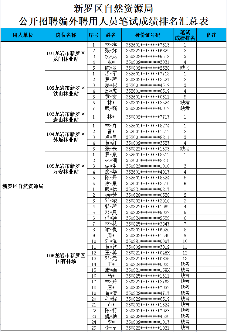 根据2022年7月7日发布的《龙岩市新罗区自然资源局关于公开招聘编外聘用人员的公告》有关要求,现将龙岩市新罗区自然资源局龙门林业站(岗位代码101)等6个岗位笔试成绩排名予以公示。