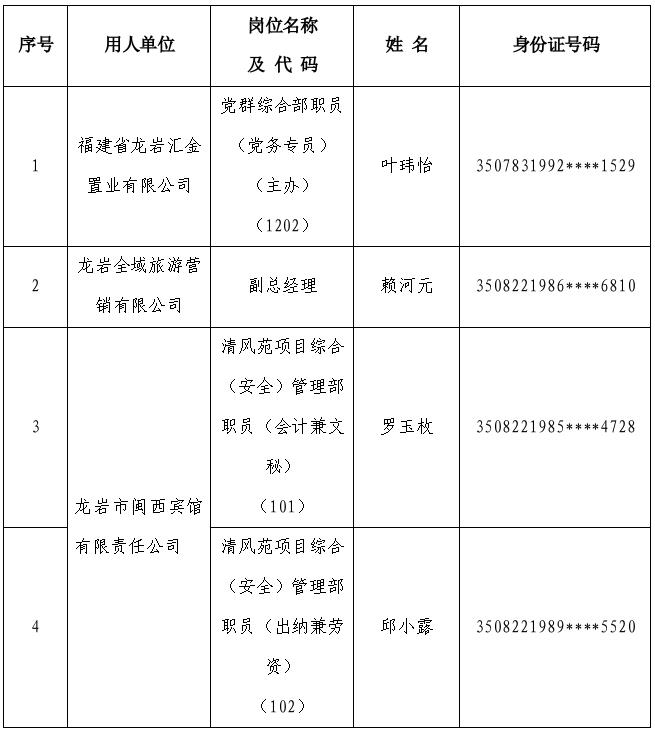 根据2022年1月15日发布的《关于龙岩市闽西宾馆有限责任公司公开招聘工作人员的公告》、2月24日发布的《关于延长龙岩文旅汇金发展集团有限公司所属企业公开遴选工作人员报名时间的公告》、4月1日发布的《关于龙岩全域旅游营销有限公司公开遴选工作人员的公告》有关要求,经报名、资格审查、组织考试、体检、考察等程序,现将福建省龙岩汇金置业有限公司党群综合部职员(党务专员)(主办)(岗位代码1202)等4个岗位拟录用人员名单公示如下: