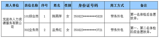 根据2022年6月7日发布了《龙岩市人力资源服务有限公司关于公开招聘外包工作人员的公告》有关要求,经报名、资格审查、组织考试、体检、考察等程序,现将龙岩市人力资源服务有限公司综合岗(岗位代码101)等2个岗位拟录用人员名单公示如下: