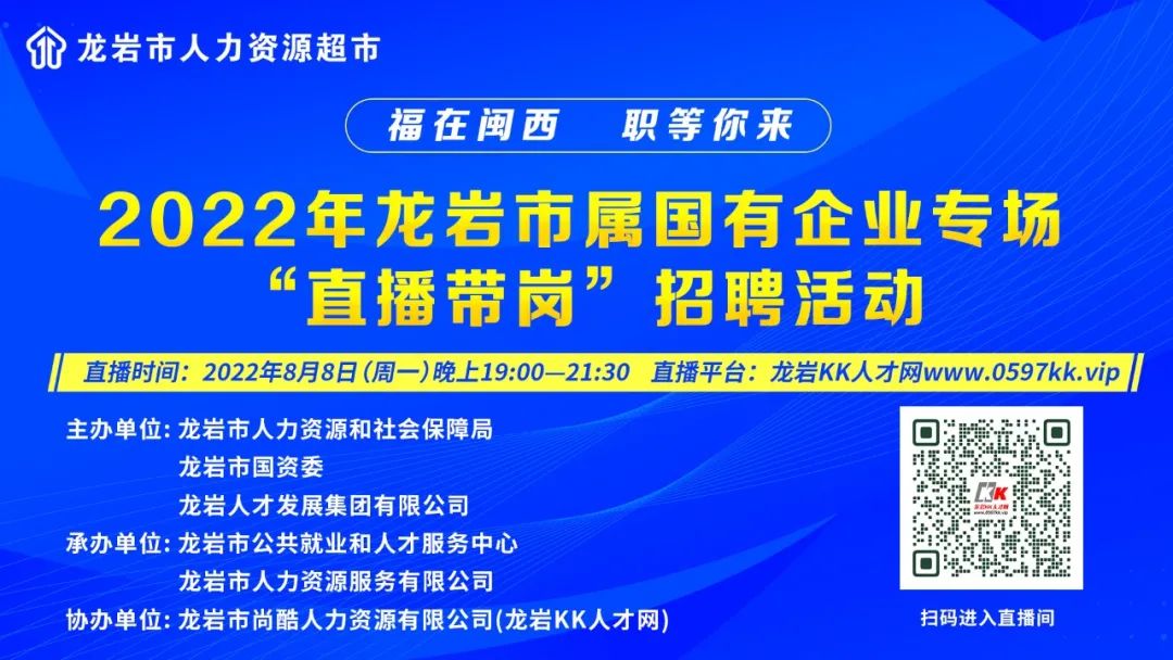 为全面落实党中央、国务院决策部署和省委、省政府关于促进高校毕业生就业的工作要求,充分发挥国有企业吸纳高校毕业生引领示范作用,促进高校毕业生更加充分更高质量就业,推进国有企业高质量发展,根据我市开展“国企拓岗招才 稳就业促发展”专项行动部署,龙岩市人力资源和社会保障局、龙岩市国资委、龙岩人才发展集团有限公司拟定于2022年8月8日(周一)晚上19:00—21:30在龙岩市人力资源超市举办“福在闽西 职等你来”2022年龙岩市属国有企业专场直播带岗招聘活动,届时诚邀各用人单位和求职者踊跃参加。