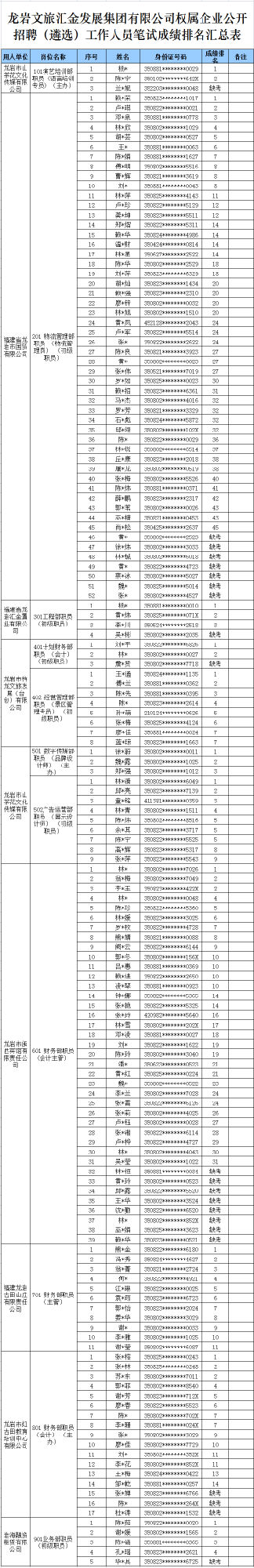 根据2022年6月24日发布的《龙岩文旅汇金发展集团有限公司权属企业公开招聘(遴选)工作人员的公告》有关要求,现将龙岩市山茶花文化传媒有限公司演艺培训部职员(语言培训专员)(主办)(岗位代码101)等11个岗位笔试成绩排名予以公示。