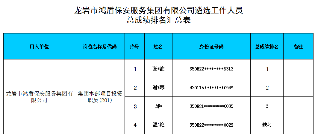 根据2022年2月28日、6月15日发布的《关于龙岩市鸿盾保安服务集团有限公司遴选工作人员的公告》、《关于龙岩市鸿盾保安服务集团有限公司遴选工作人员延期报名的补充公告》有关要求,集团本部项目投资职员(岗位代码201)考试(面试)环节已经我司组织完成,现将总成绩排名予以公示。