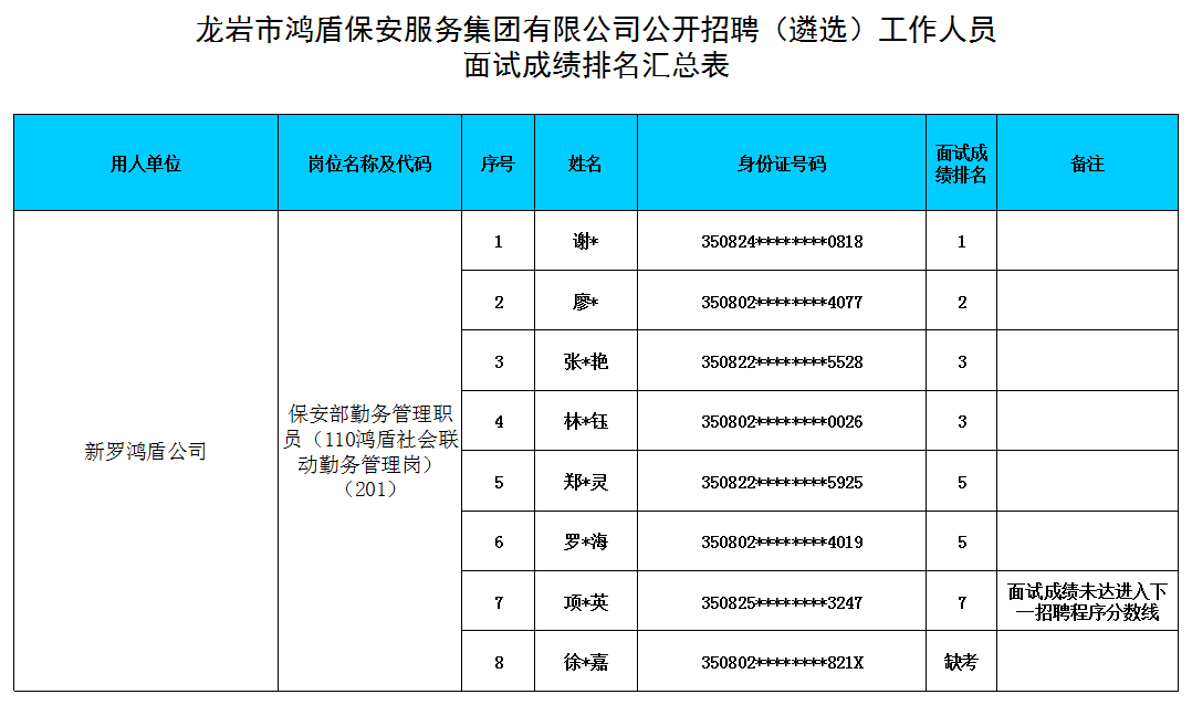 根据2022年7月26日发布的《关于龙岩市鸿盾保安服务集团有限公司公开招聘(遴选)工作人员的公告》有关要求,新罗鸿盾公司保安部勤务管理职员(110鸿盾社会联动勤务管理岗)(岗位代码201)考试(面试)环节已经我司组织完成,现将面试成绩排名予以公示。