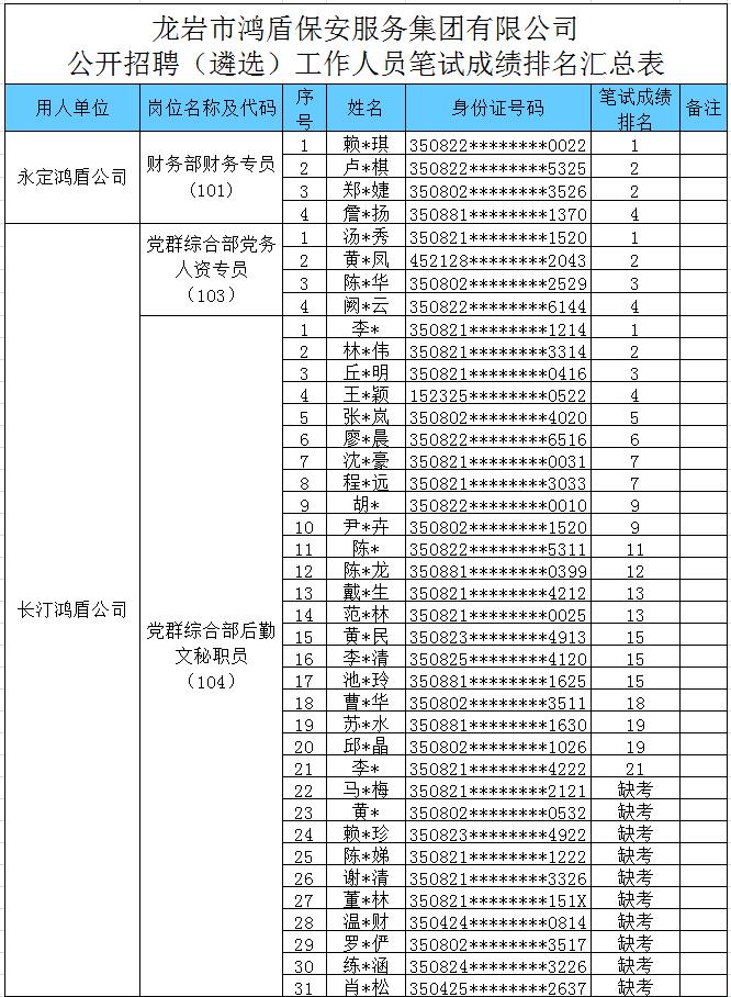 根据2022年8月8日发布的《关于龙岩市鸿盾保安服务集团有限公司公开招聘(遴选)工作人员的公告》有关要求,现将永定鸿盾公司财务部财务专员(岗位代码101)等3个岗位笔试成绩排名予以公示。