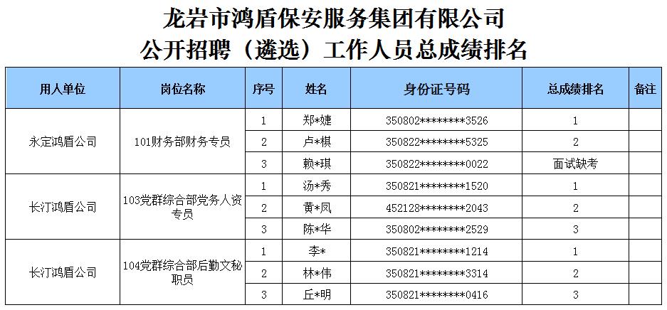 根据2022年8月8日发布的《关于龙岩市鸿盾保安服务集团有限公司公开招聘(遴选)工作人员的公告》有关要求,永定鸿盾公司财务部财务专员(岗位代码101)等3个岗位考试(笔试+面试)环节已经我司组织完成,现将总成绩排名予以公示。