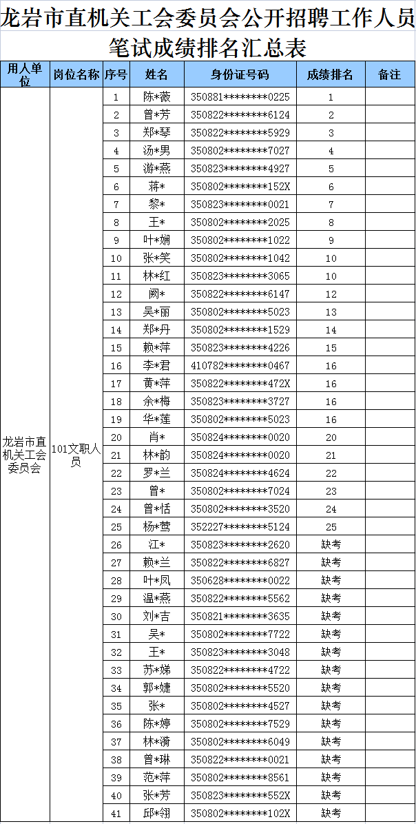 根据2022年7月14日发布的《龙岩市直机关工会委员会关于公开招聘工作人员的公告》有关要求,现将龙岩市直机关工会委员会文秘人员(岗位代码101)笔试成绩排名予以公示。