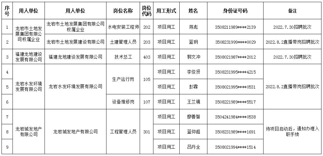根据2022年7月30日发布了《龙岩市属国有企业公开招聘资本运作人才公告》、2022年8月2日发布《“福在闽西 职等你来”2022年龙岩市属国有企业专场直播带岗招聘活动》有关要求,经报名、资格审查、组织考试、体检、考察等程序,现将拟录用人员名单公示如下: