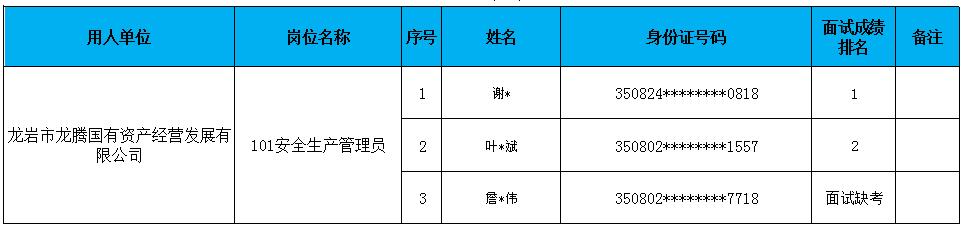 根据2022年9月29日发布的《关于龙岩市龙腾国有资产经营发展有限公司公开遴选工作人员的公告》有关要求,龙岩市腾祥企业管理有限公司安全生产管理员(岗位代码101)考试(面试)环节已经我司组织完成,现将面试成绩排名予以公示。