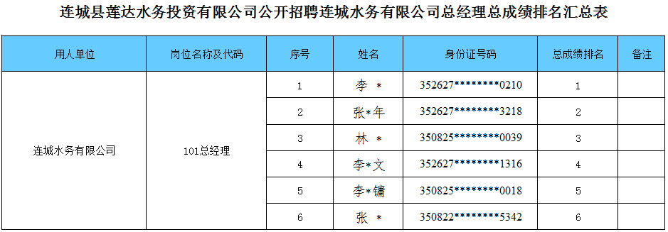 根据2022年10月14日发布的《连城县莲达水务投资有限公司公开招聘连城水务有限公司总经理的公告》有关要求,连城水务有限公司总经理(岗位代码101)考试(面试)环节已由福建连城国有投资集团有限公司组织完成,现将总成绩排名予以公示。