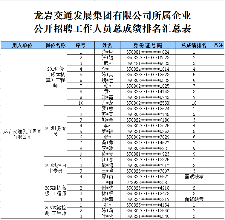 根据2022年8月7日发布的《关于龙岩交通发展集团有限公司招聘工作人员的公告》有关要求,龙岩交通发展集团有限公司所属二级企业造价(成本核算)工程师(岗位代码201)等5个岗位考试(笔试+面试)环节已由我司组织完成,现将总成绩排名予以公示。
