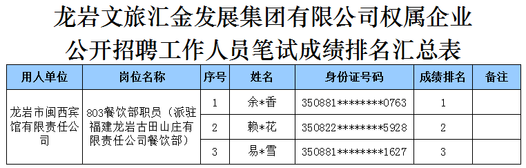 根据2023年1月16日发布的《关于龙岩文旅汇金发展集团有限公司权属企业公开招聘(遴选)工作人员的公告》、2023年3月9日发布的《龙岩文旅汇金发展集团有限公司权属企业公开招聘(遴选)工作人员部分岗位延期报名的补充公告》及2023年6月4日发布的《龙岩文旅汇金发展集团有限公司权属企业公开招聘工作人员803岗位再次延期报名的补充公告》有关要求,现将龙岩市闽西宾馆有限责任公司餐饮部职员(派驻福建龙岩古田山庄有限责任公司餐饮部)(岗位代码803)笔试成绩排名予以公示。