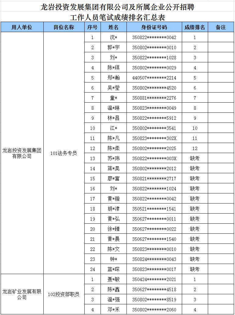 根据2025年9月4日发布的《龙岩投资发展集团有限公司及所属企业关于公开招聘工作人员的公告》有关要求,现将龙岩投资发展集团有限公司法务专员(岗位代码101)等2个岗位笔试成绩排名予以公示。