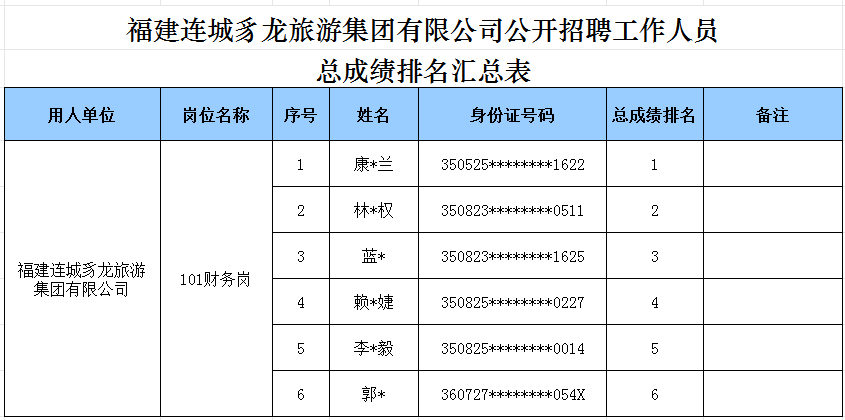 根据2025年11月11日发布的《福建连城豸龙旅游集团有限公司关于公开招聘工作人员的公告》有关要求,福建连城豸龙旅游集团有限公司财务岗(岗位代码101)考试(笔试+面试)环节已经我司组织完成,现将总成绩排名予以公示。