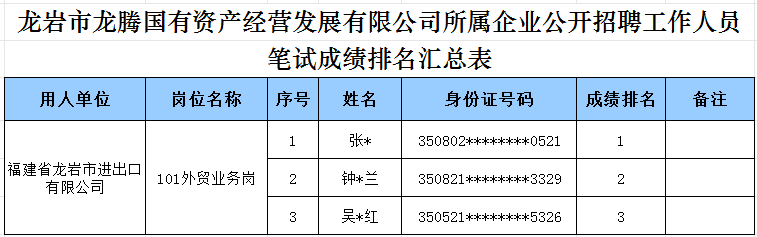 根据2025年12月31日发布的《龙岩市龙腾国有资产经营发展有限公司所属企业关于公开招聘(遴选)工作人员的公告》有关要求,现将福建省龙岩市进出口有限公司外贸业务岗(岗位代码101)笔试成绩排名予以公示。
