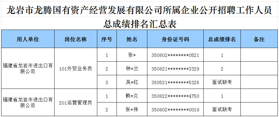 根据2025年12月31日发布的《龙岩市龙腾国有资产经营发展有限公司所属企业关于公开招聘(遴选)工作人员的公告》有关要求,福建省龙岩市进出口有限公司外贸业务岗(岗位代码101)等2个岗位考试(笔试+面试、面试)环节已经我司组织完成,现将总成绩排名予以公示。